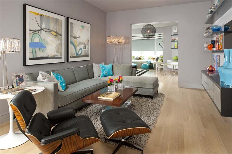 Đậm hơn một chút, ở đây các màu tối được sử dụng với nhiều mức độ khác nhau thay đổi nhẹ nhàng. Bên cạnh màu xám của tường nhà, ghế sofa đã có một bộ bàn ghế tựa lại có màu đen than chì. Thêm vào đó là các chi tiết trang trí chấm phá màu xanh nhẹ làm bừng sáng lên không gian sang trọng.