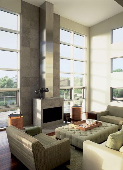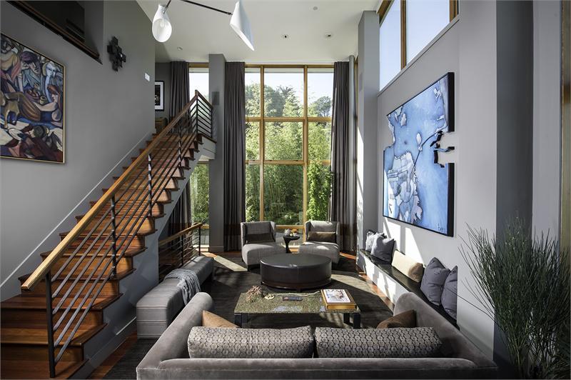 Nhờ lợi thế về phía trước mặt tiền sở hữu vườn cây cối xanh tươi mát, phòng khách này cũng đã được khéo léo sử dụng kính trong suốt, lắp đặt đồng thời cửa với kích thước đủ lớn để một mặt có thể chiêm ngưỡng phong cảnh bên ngoài, mặt khác vừa giúp ánh sáng được tự do ùa vào nhà. Một điểm nhấn đó là cầu thang bằng gỗ với vẻ đẹp cổ điển. Vì lẽ đó, mặc dù phần lớn nội thất trong căn phòng đều là màu tối nhưng không kém phần tươi sáng.