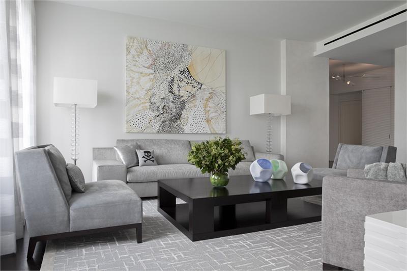 Ở đây, một kết hợp của đường nét và chi tiết nội thất được nhấn mạnh với các sắc thái khác nhau của màu xám bóng. Ngay từ bàn cà phê gần như màu đen và ghế bành màu than cho đến ghế sofa nhạt màu hơn.